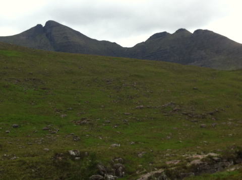 Sgurr Mhorはその形の異様さに驚かされる。頂きがぱっくり割けている。 Na Rathananま