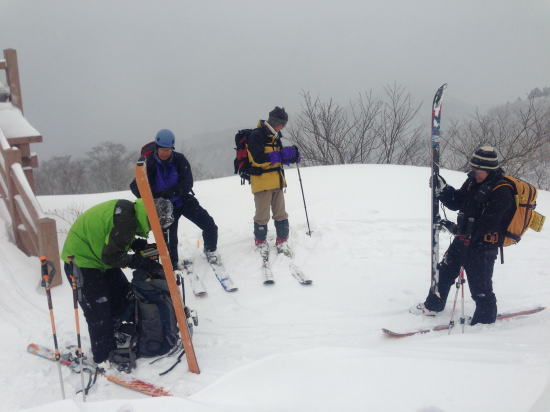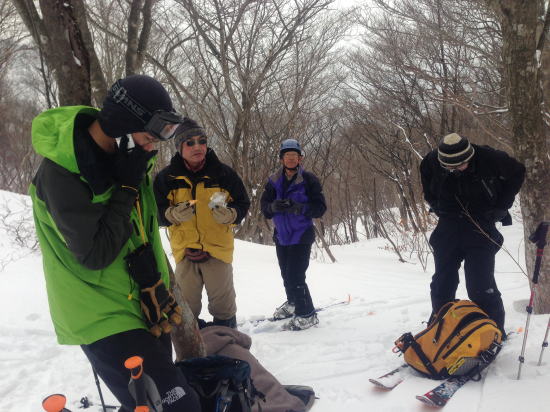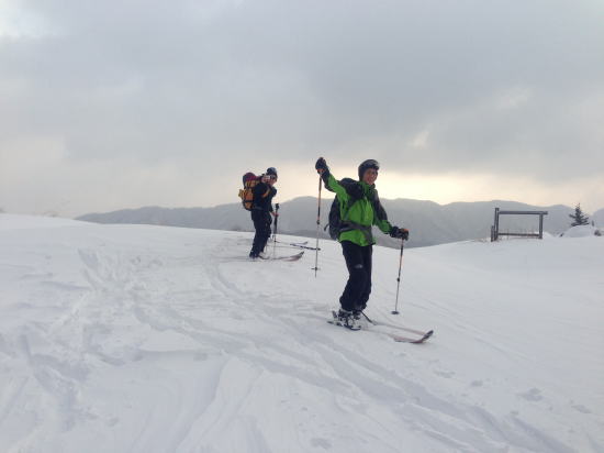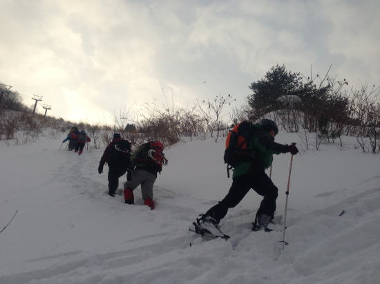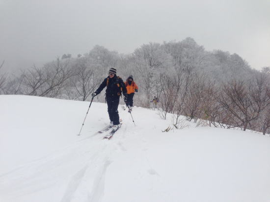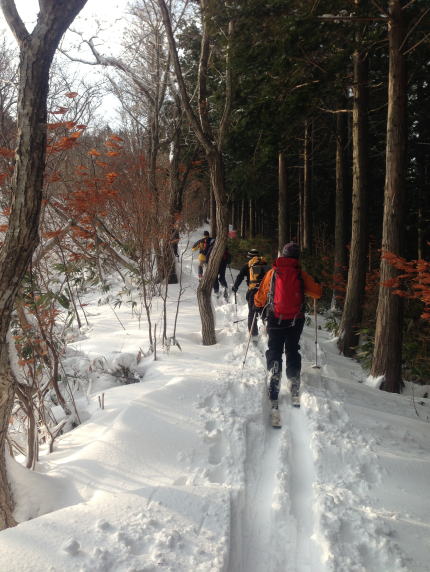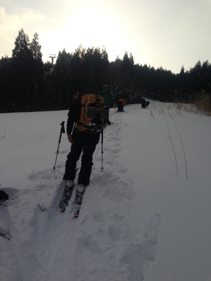 説明をした後、旧貝月ゲレンデトップまでの標高差250mをそれぞれのコース取りで登る。ゲレンデトップには