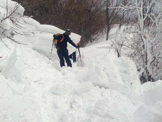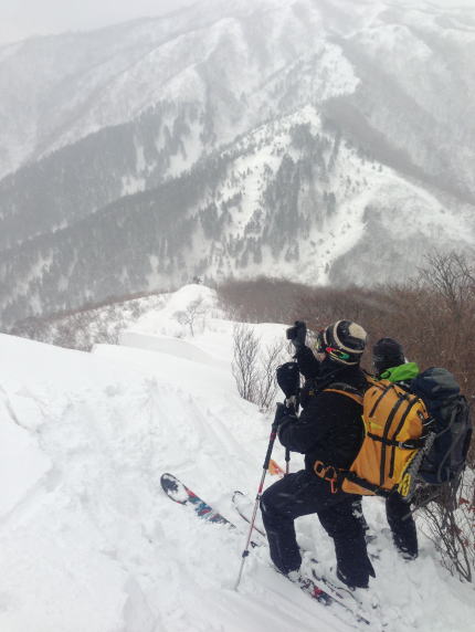 させてもらった。 途中、雪庇がコースを遮断している個所があり、それを崩してコースを作ったり、貝月山から