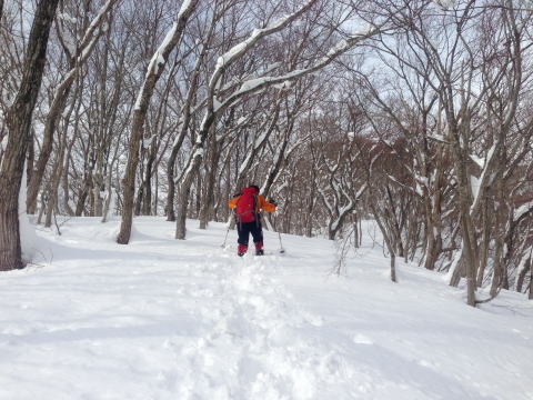 の良い尾根歩きとなるが、ワカンを付けていても膝まで潜る。 標高730m付近のジャンクションまで登って、