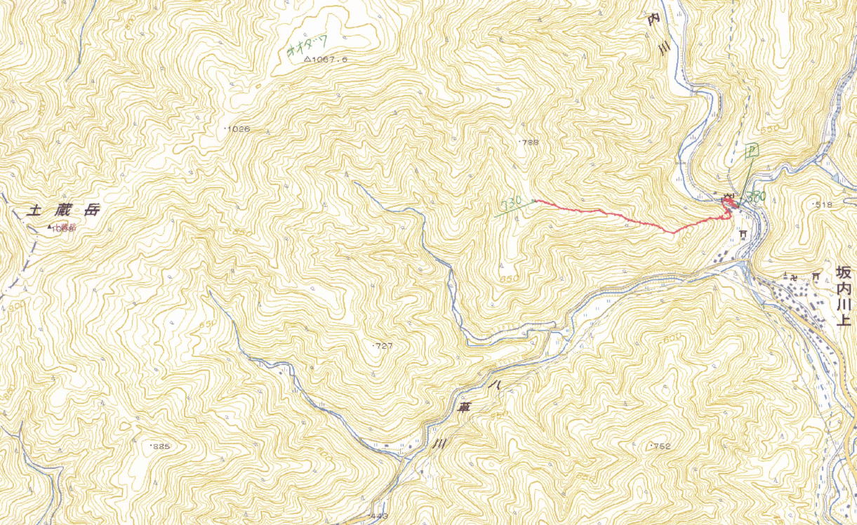 自宅(8:50)−美濃川上駐車場(9:40〜10:00)−標高730m付近(12:10)−