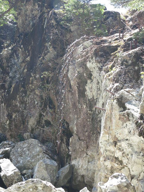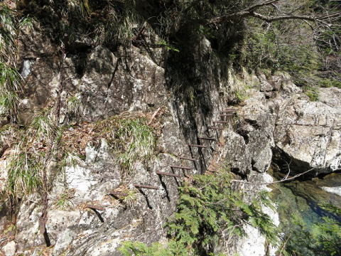 双門コース名物2のボルト登山道、川から5m程の高さ。