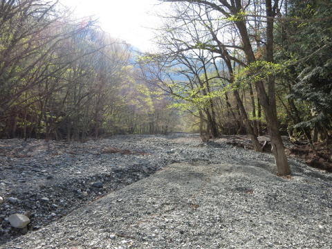 登山道から林道から落ち立つだだっ広い河原、