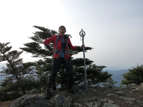 大峰最高峰八経ヶ岳頂で。錫杖を掴んで仁王立ちのポーズ。