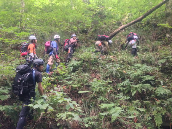 上部は結構なヤブでした。ルートを外さないよう、みんなで読図?(やっぱり
