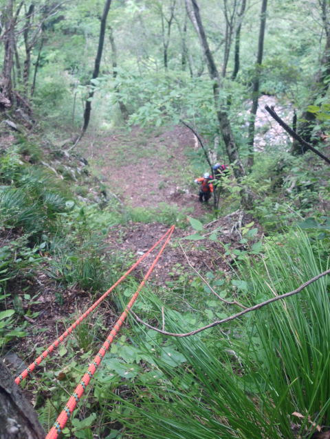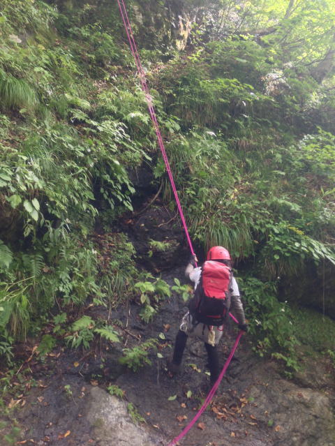沢に戻るため、懸垂下降。