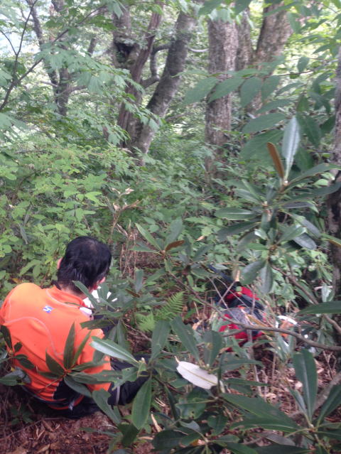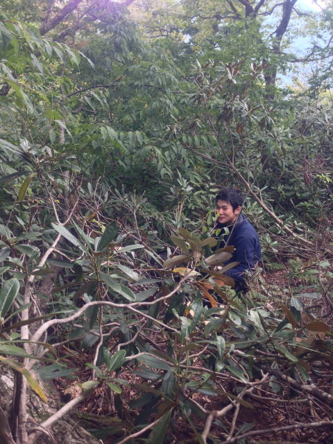 藪漕ぎに疲れ、小休止する南国人の仲尾J君。