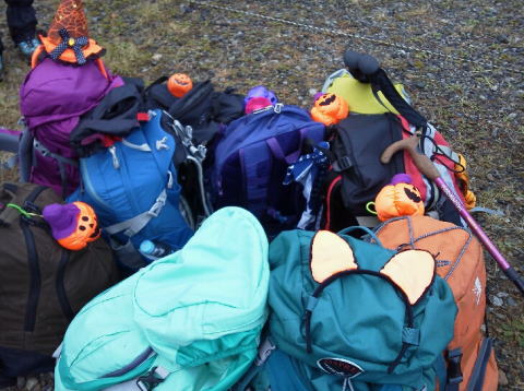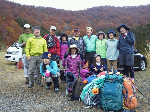 紅葉の中、ハロウインのコスプレをちょっと身に着けて13名が登山口に集合です。