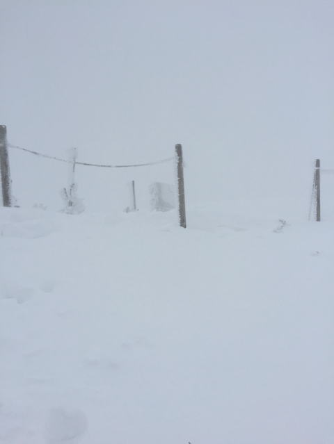 主稜線コルに出た。結構な風と、視界が効かない状態。ここから、慎重に