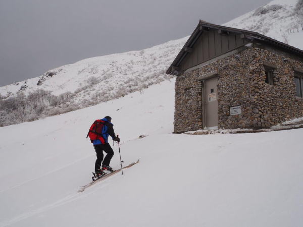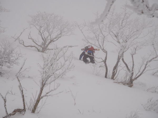 主稜線コルにつき上げる、直登ルートを登って、ホワイトアウトの中、滑ってきました。