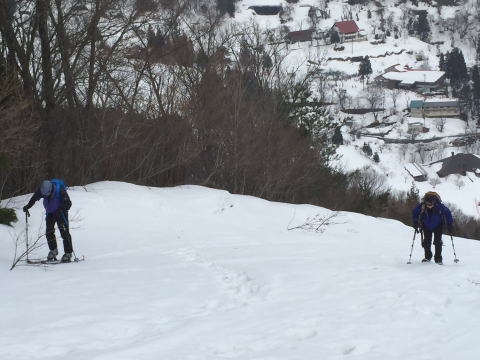 旧貝月ゲレンデリフトトップまで、山スキー、ワカン、スノーシューとそれぞれ好きなスタイルで登る。