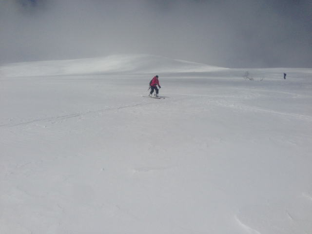 を横切り、目国内岳目指して登ること標高差で300m。頂上付近はガスって風もあって、