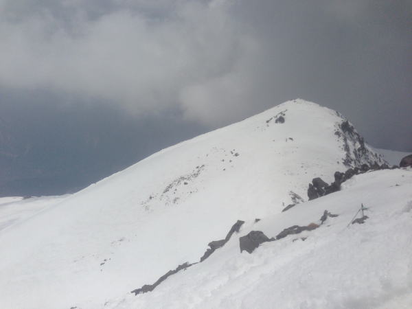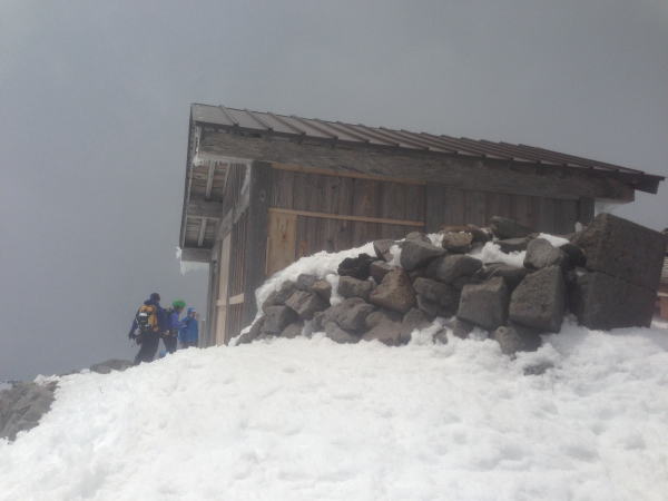 楽をさせていただきました。 肩の小屋上からは、スキーアイゼンで登りました。頂上直下でス