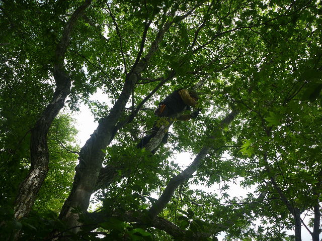 ルートを確認するために木に登る育さん