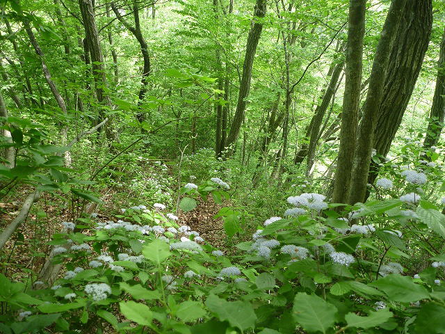 ブナ林ではありませんが、クヌギの類の林で新緑と山アジサイが咲いておりました。