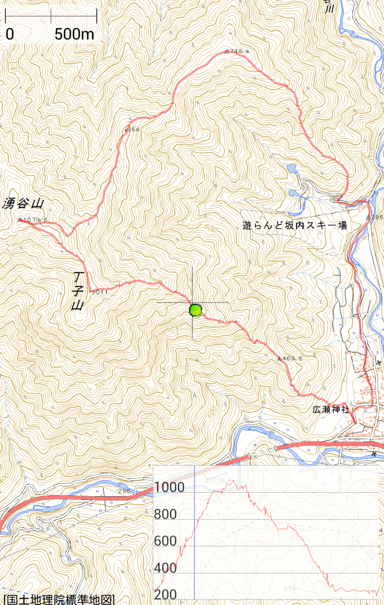広瀬神社7:00・・・△469.6m 7:45・・・丁子山9:35・・・湧谷山 △1079.7m 10:10/10:45・・・854m12:00