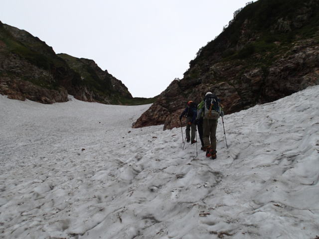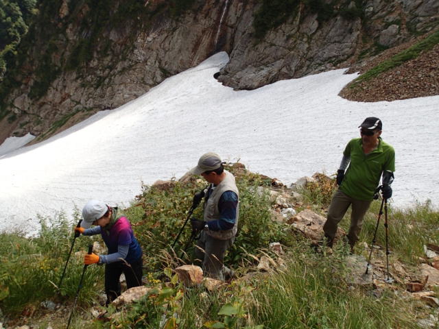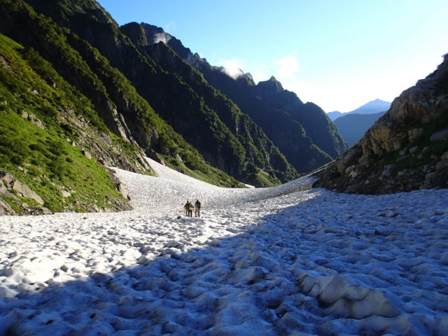 剣沢雪渓、アイゼン効かせ快適に下る。