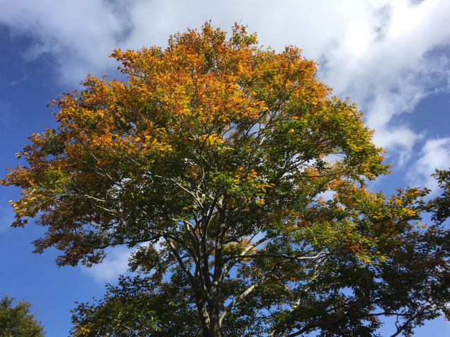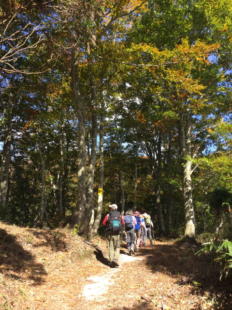 例のごとく、義理の母のディサービスの送迎車を見送ってから出かけた。秋晴れの中、ブナの黄葉が映えて