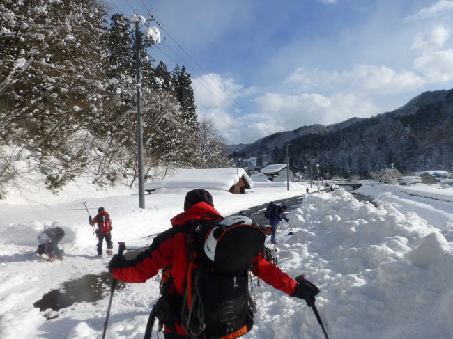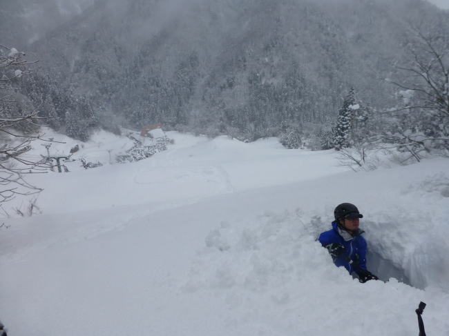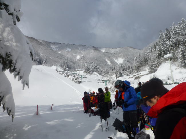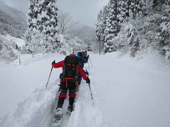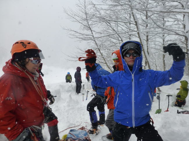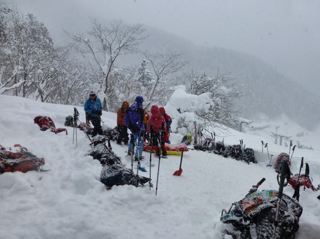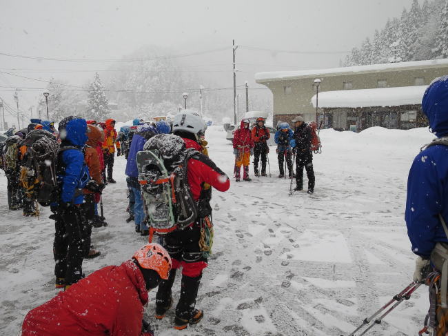 前々日からの降雪で、現地は1m近くの積雪。当日も朝から吹雪いている中、総勢33名により岐阜県勤労者山岳連盟・