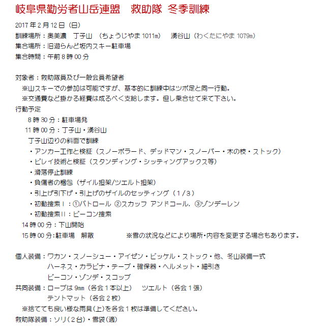 2017年2月12日(日)岐阜県勤労者山岳連盟 救助隊 冬季訓練