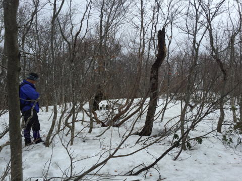 眺望もきかずで、915m付近コブで早々に撤退の判断。870m付近のジャンクションから藪がひどくなり、雪は出てくるが