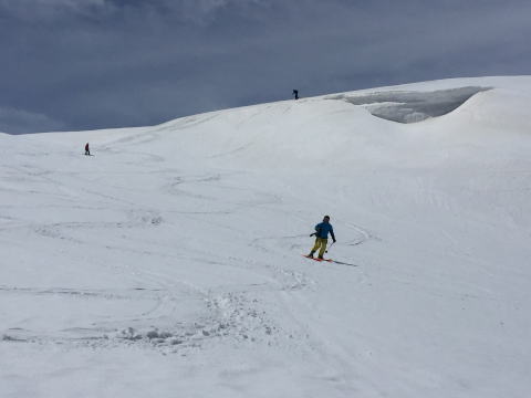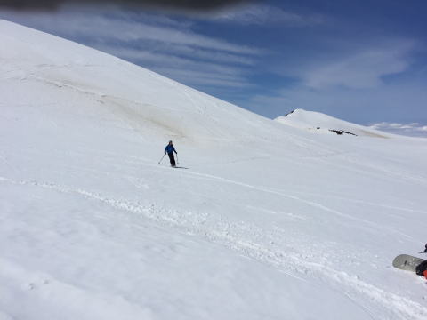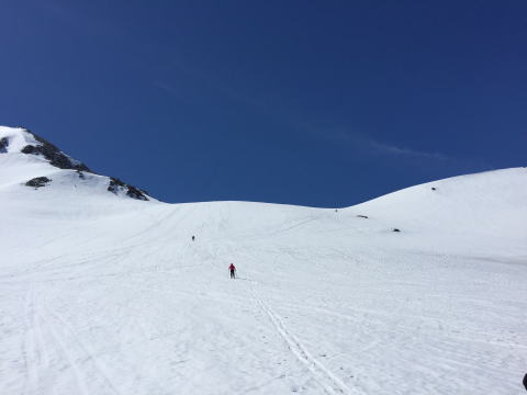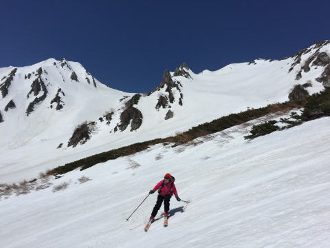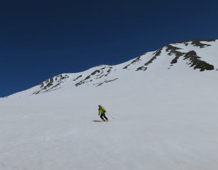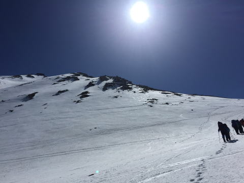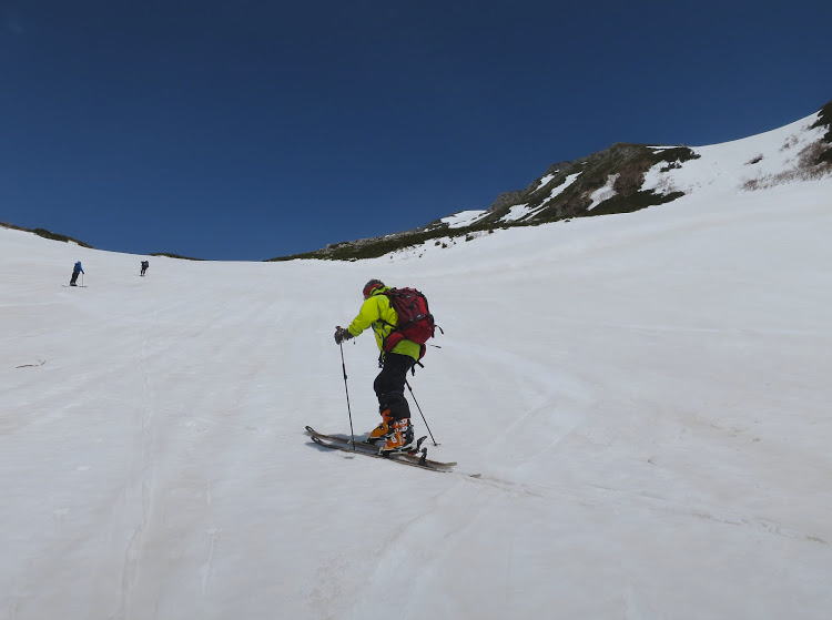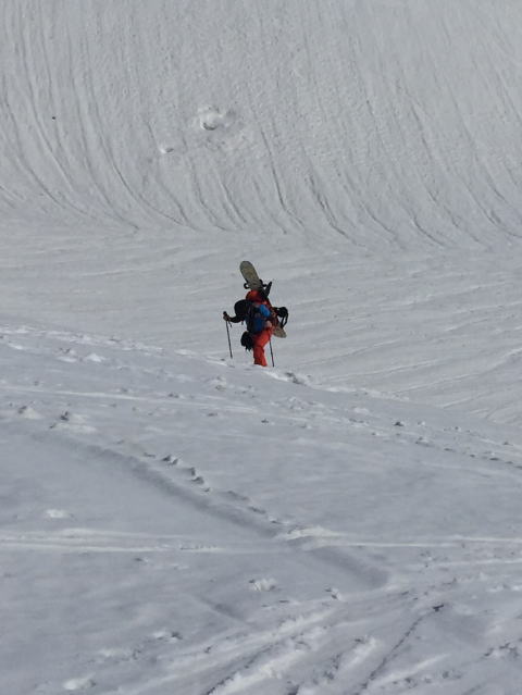 滑降は、標高2,150m付近まで気持ちよく滑れました。560mの登り返しは案外きつかったですが、満足のいく斜面