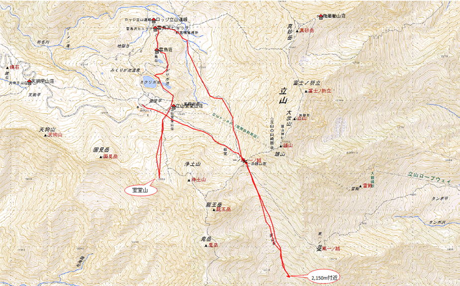 | 23日 6:20立山駅→7:30室堂8:00→9:10一の越9:20滑降開始10:00御山谷P2150登り返し→12:30一の越 →13:40雷鳥沢ヒュッテ |