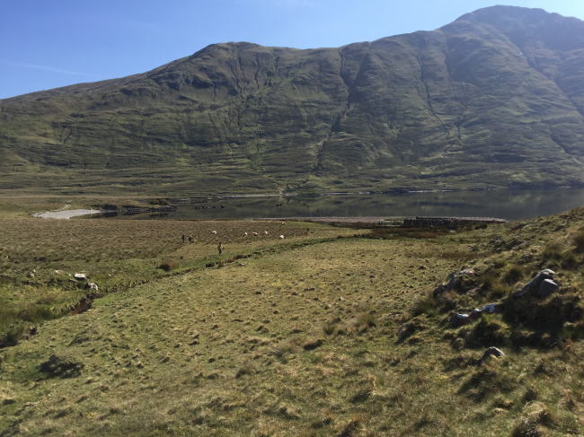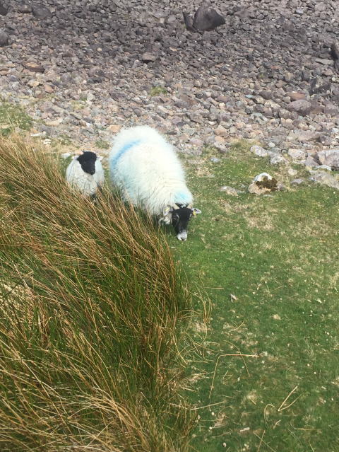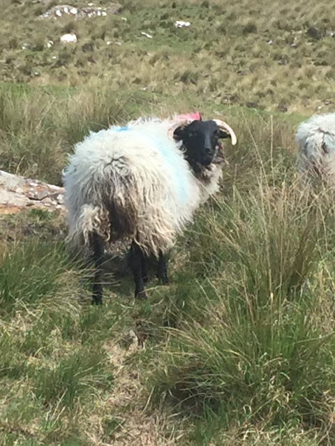 山の東側に位置する湖「Doo Lough」の畔から登り始めます。ゴートの出迎えです。