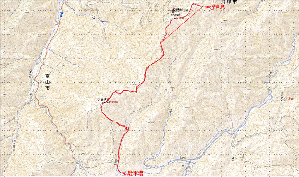 | 岐阜県庁(4:00)−各務原IC−飛騨清見IC(5:30)−R158−R41−R471−駐車場(7:20)−登山口(P 7:50) |