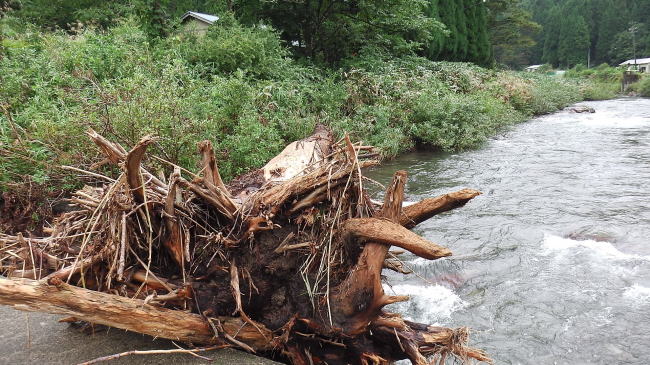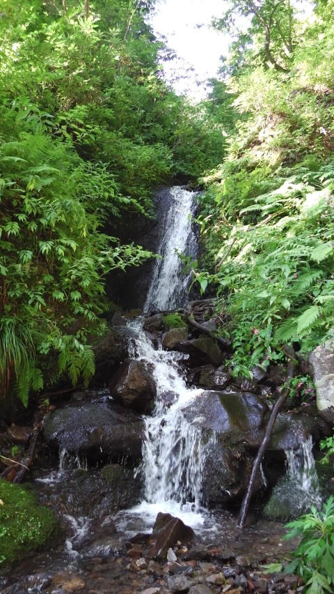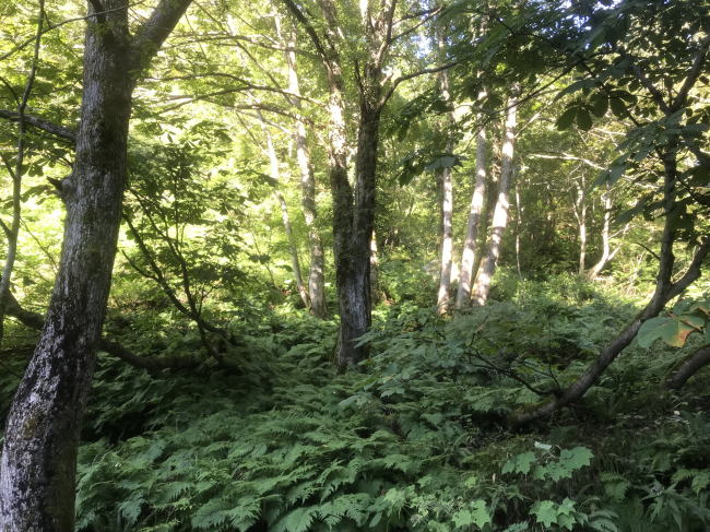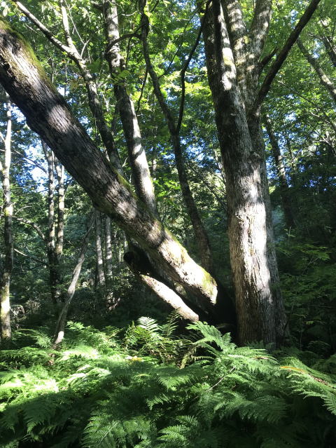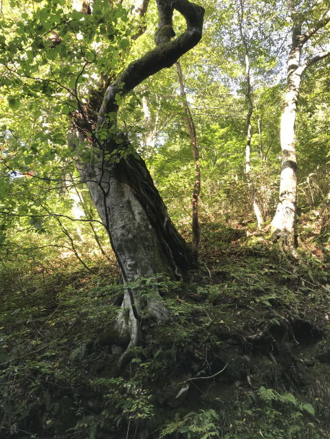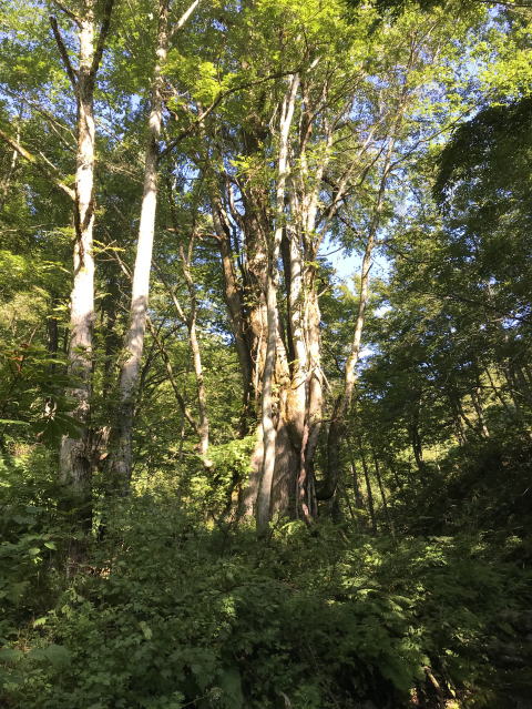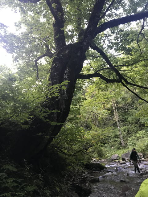 ブナや桂の巨木を見ながら千回沢山へ。その後テントを撤収して岐路につく。体調不良者をみんなでサポートし