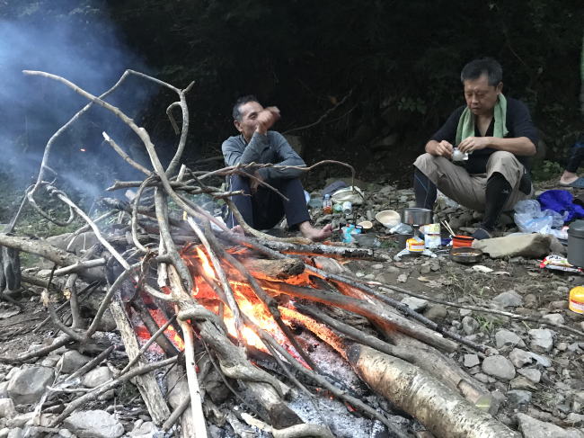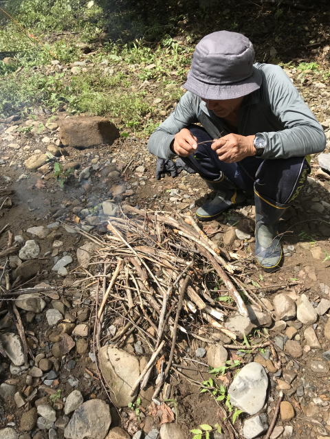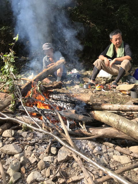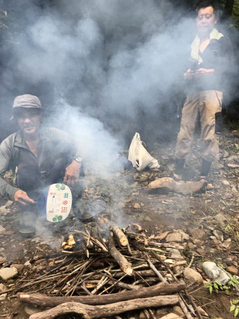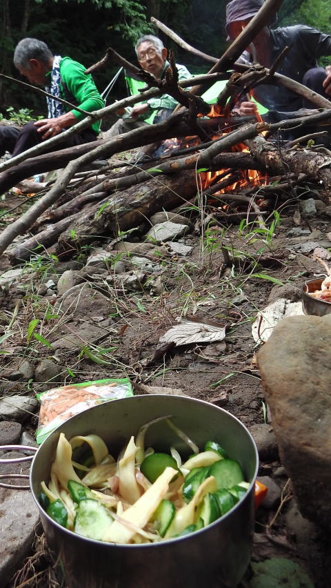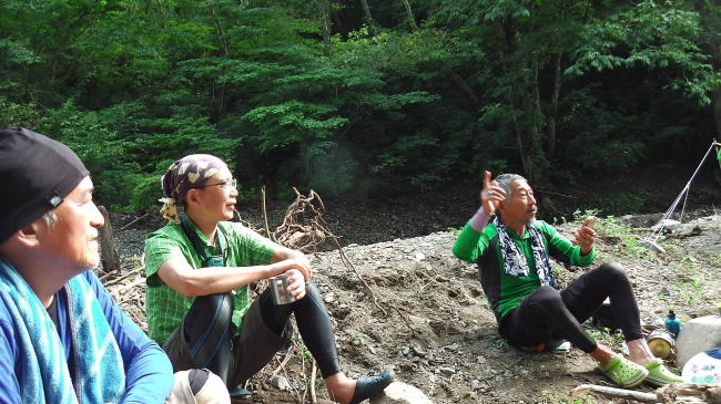 林道終点(蔵ヶ谷出合)まで、1時間少々。その中洲でツェルトを張り、焚き火着火から延々と8時間の宴会に