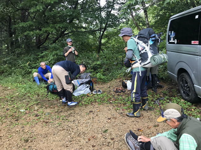 黒谷降り口・地蔵さんで身支度をする。若干1名の爺が長靴。