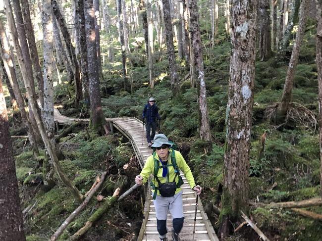 | 小坂登山口から登り始めると、旧登山道が通行止めの為ルート変更となっています、整備されていて歩きやすいが、しいて言えば木道が多く滑りやすいので注意。 |