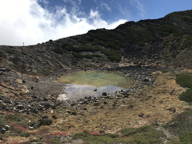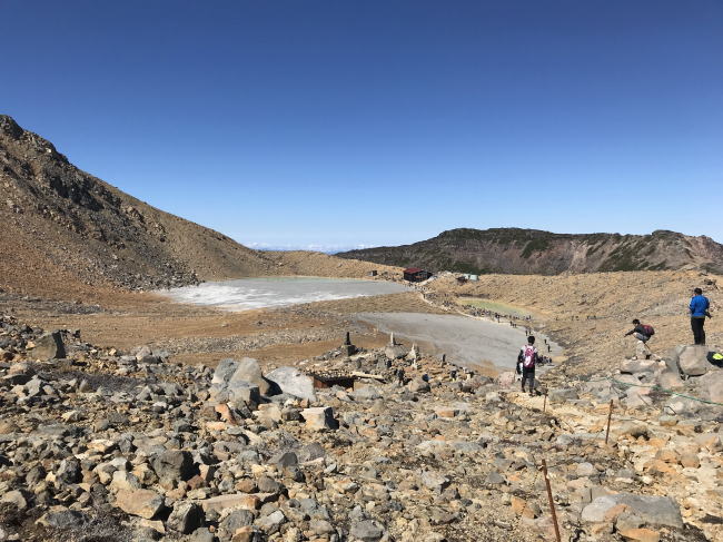 | 期間限定で山頂までの登山道が規制解除との事、未だ登った事のなかった御嶽山へ紅葉と慰霊登山に出掛けました。7時前に小坂登山口に着くが既に満車(計画書のコースタイムが甘かった・・) 登山道は整備され歩きやすかった、ニノ池まで行くと噴火の痕跡が多々残っており、灰色の火山灰で埋まった池や噴石で破壊された石像等が印象的でした。その先、黒沢十字路にて規制をしており、正午までにこの場所に下山との事で、剣ケ峰には行けず残念だった。係の方の話しでは来年の山開きまでには規制を解除できるようにしたいとの事でした。 |