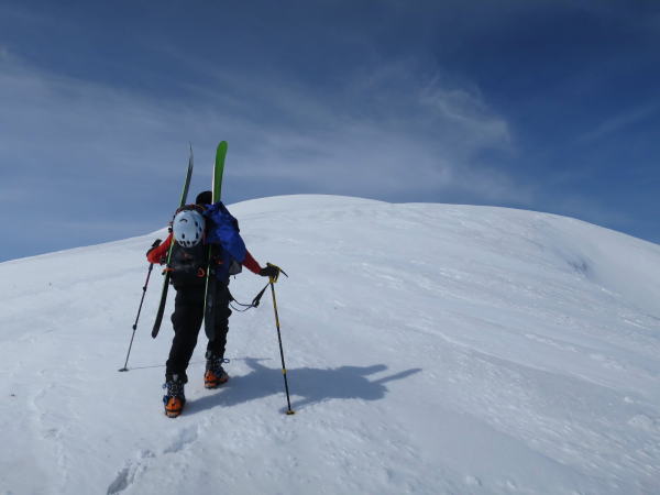| 峠から上は反面硬いパックスノーとなりシール登高は諦めシートラにツボ足&アイゼンでの歩行に切り替え |