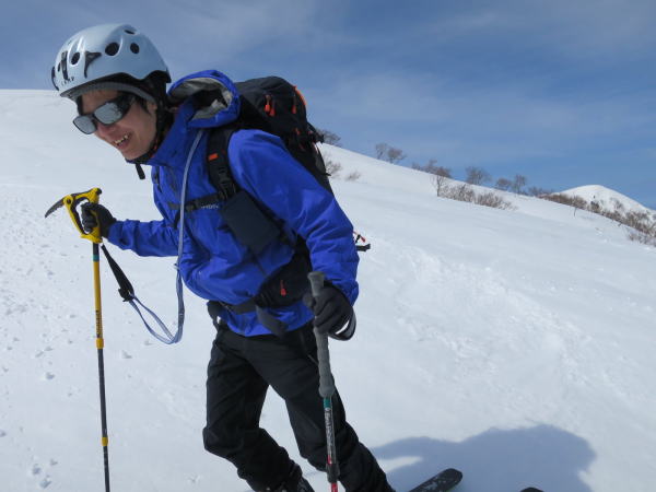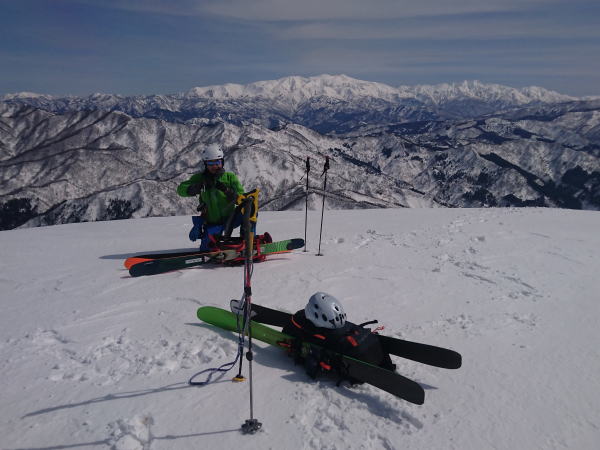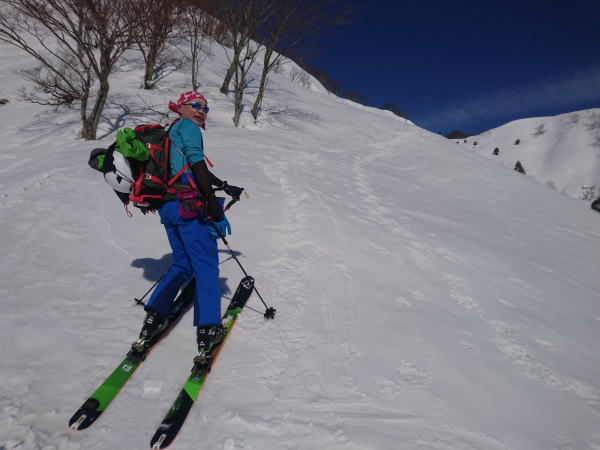 | 今日は朝から暖かく大日峠まではザラメで先週気を使ったトラバースは緩い雪である意味気をつかった。 |