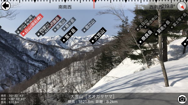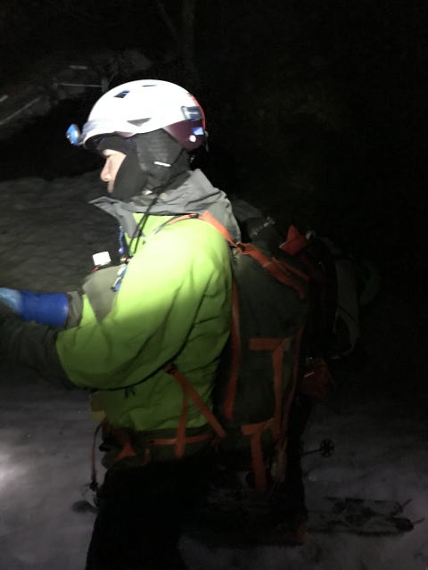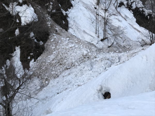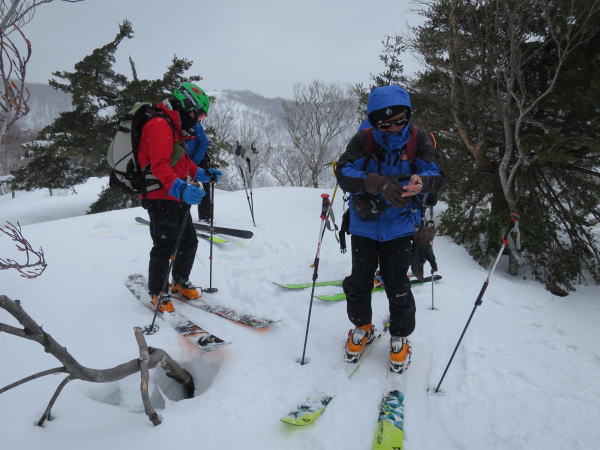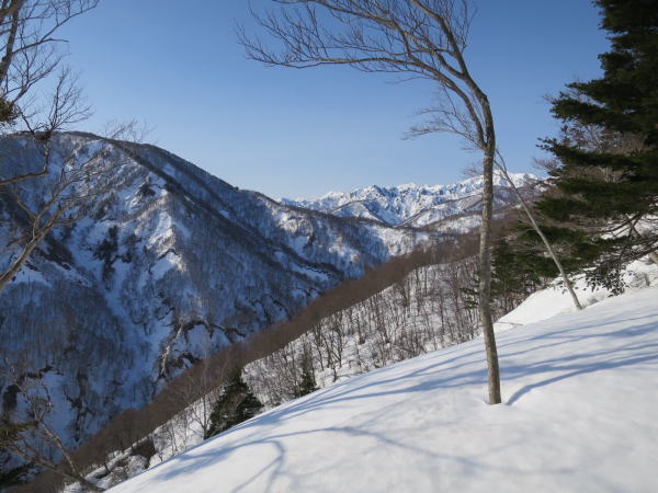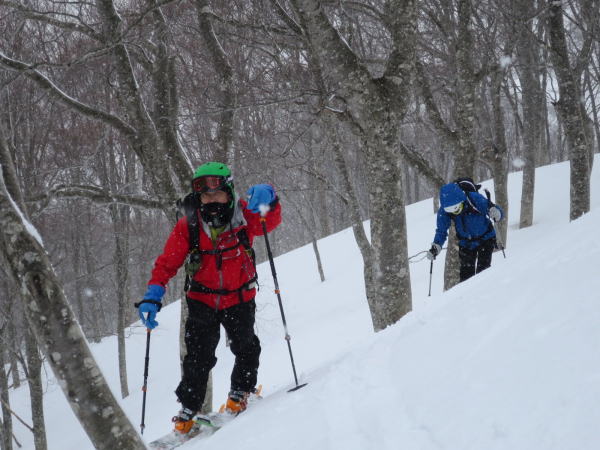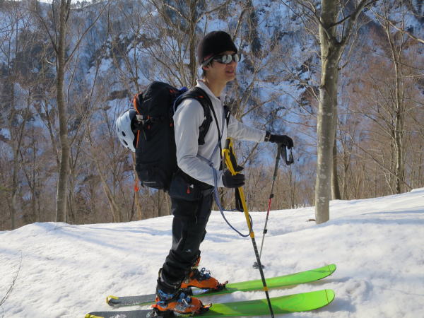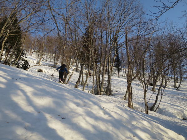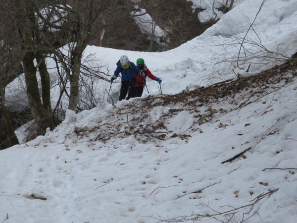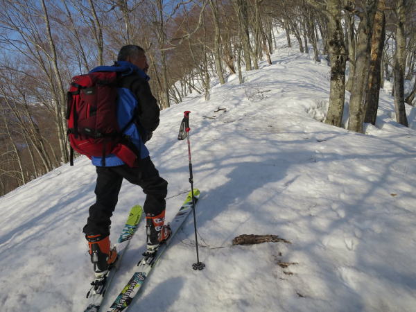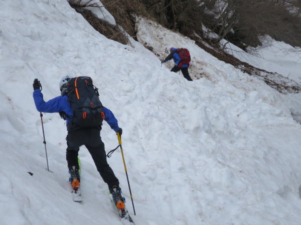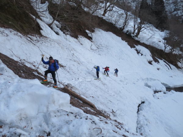 | 早朝出発時だったので、雪はクラストしていた。林道は所々デブリで覆われていた。林道から尾根に取付いた斜面はクラスト気味で、クトーを装着。それでも登り切れなかった者は板を担いだ。 |
