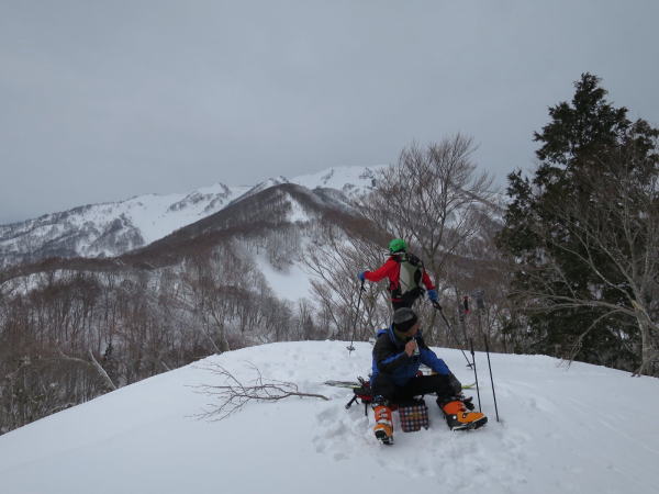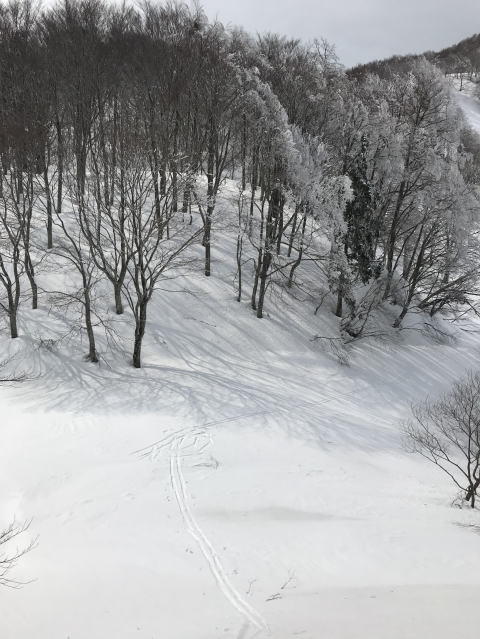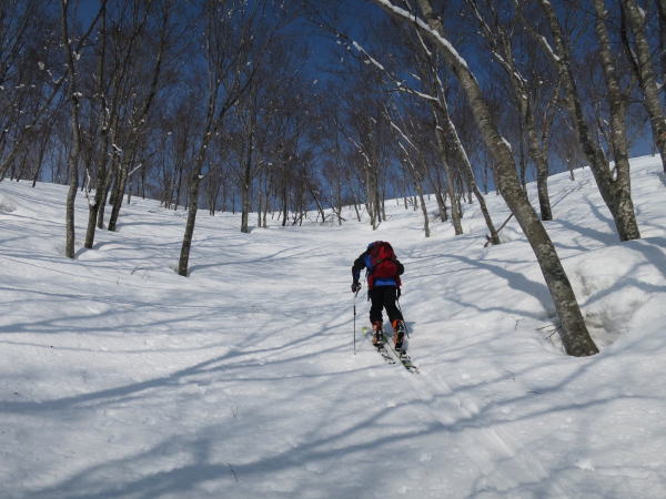 | 大門山は遠かった。ブナオ峠に至る尾根はブナに覆われていてシール登高していて気持ちよく心を癒された。 |