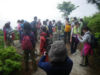 小倉山に到着です。ガスってます。 小雨が降る中の豚汁は身体が温まってサイコーでした。
