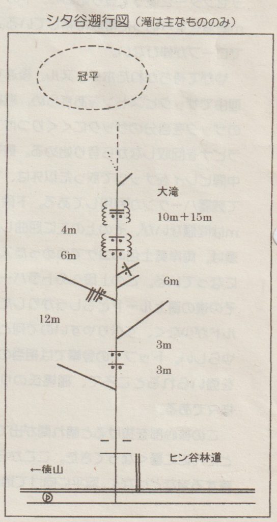 - T橋(♂)のリードで、懸案だった奥美濃の沢のひとつを遡行することができた。シタ谷は冠山のふもとの冠平を水源地とする沢である。上流の25m大滝がこの沢の核心部で、遡行の成否はこの滝を無事クリアできるかにかかっている。