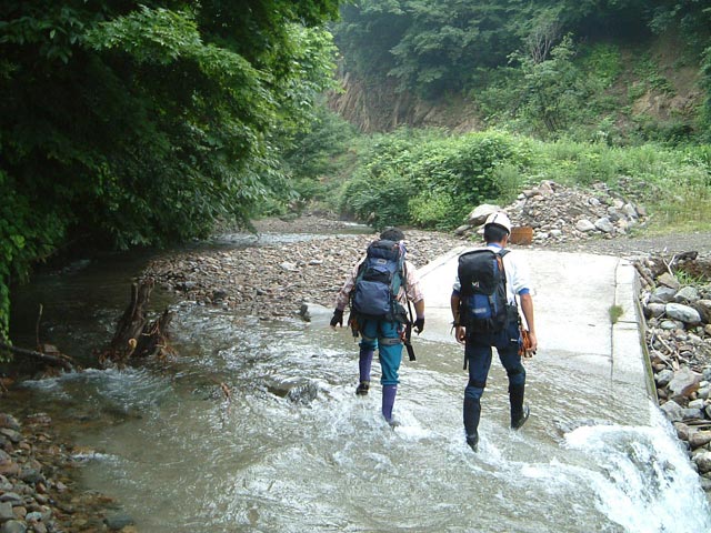 - 車2台で冠山峠に上がり、下山用に伊Tジムニーをデポする。峠付近は霧が出て涼しく、ここが”山”であることを感じる。シタ谷は最近の降雨で増水しており、その水量は林道の上に勢いよく流れ出している。この手前100mほどを戻って駐車し出発。