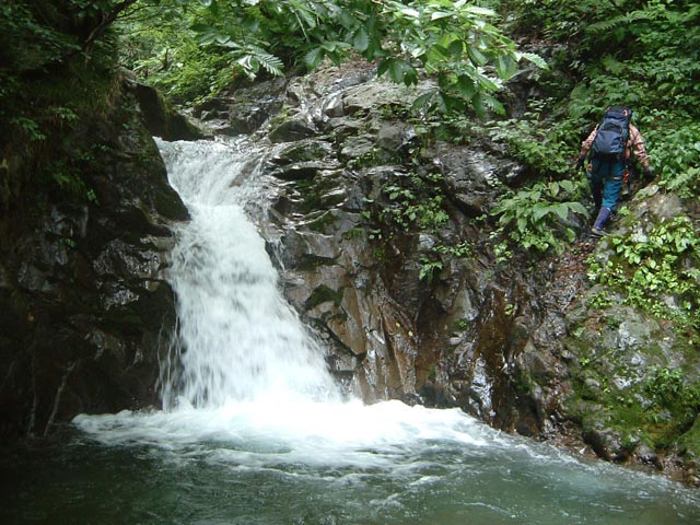 - 最初の二又をすぎると、ようやく斜度が出てきて沢登りらしくなる。連続する3mほどの滝は、いずれも小さく巻く。このころから左前方に冠山の大岩壁が表れだし、期待が高まる。次の6mは直登困難のもようで、手前の右岸ルンゼから上流の4m滝もまとめて巻き上がる。