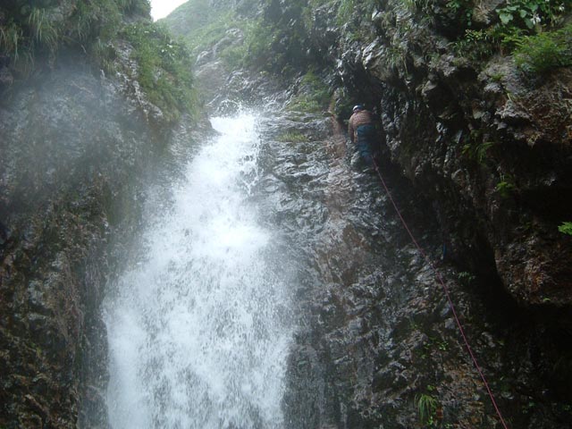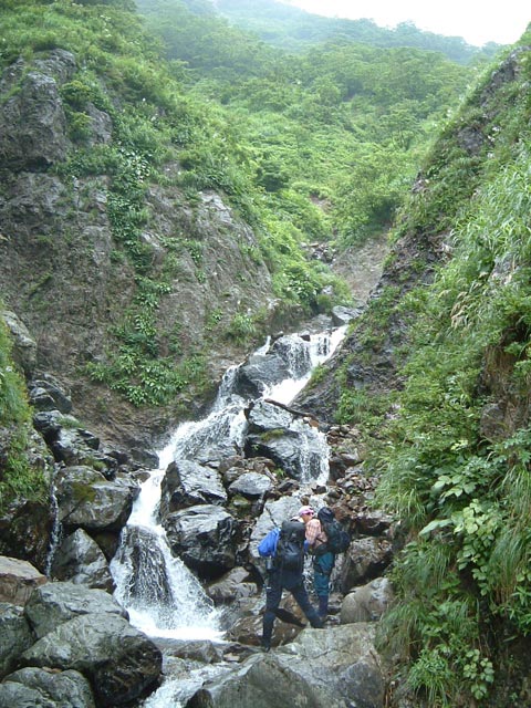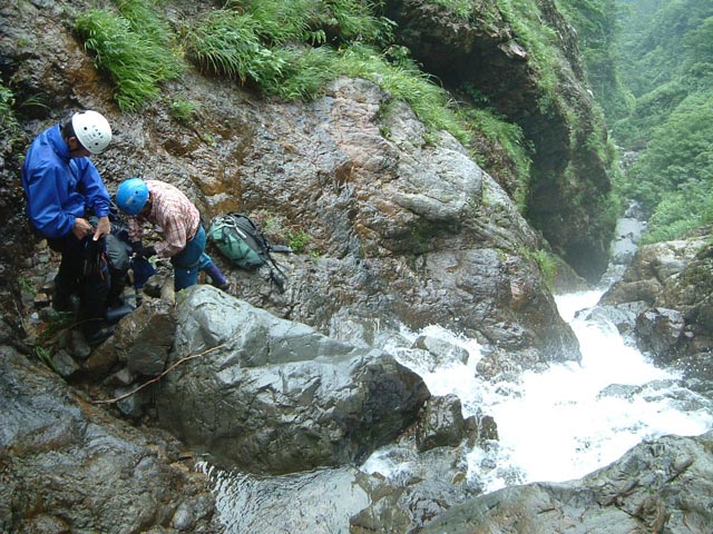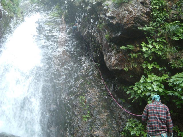 - やがて飛沫をあげてゴルジュの中を落ちる15mの直瀑。これが冠大滝に違いない。25mと聞いていたが、下から見えるのは下段だけでその上は見えない。とりつきの第一印象は難しそうだが、よく見ると水流右側の岩角にホールドがみつかる。それまでときどき晴れ間がのぞいたりしたのだが、あいにくの核心部でポツポツ雨が落ち始め、あたりはガスに包まれてきた。トップが空身で登ってあとからザックを上げることや、ホイッスルの合図を決めて坂T確保でT橋(♂)が岩に取り付く。20分余りでオーケーのホイッスル。45mのロープはほぼいっぱい。体温が急に下がって寒いので雨具を付ける。続いて伊Tがアッセンダーを使って登り始める。下の15m直瀑を登り切った後は苦戦しているようでロープが伸びない。やがて待ちかねたホイッスル。後術する理由でザックピストンを諦め、T橋(♂)のザックを自分のザックにくくりつけてカラビナを回収しながら登り始める。最初の中間ビレーをナッツで取った以外は、すべて残置ハーケンが利用してある。下段15mは問題ないのであるが、その上に左に屈曲した斜瀑は、両岸黄土色のコケでぬめったスラブになっている。この上段へのトラバース、その後の直ルートともしっかりとしたホールドが少なく、すべりやすいので何ともいやらしい。トップでの登攀は相当の緊張を強いられるところで、T橋(♂)のリード様々である。