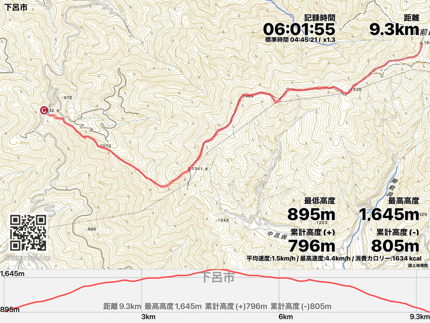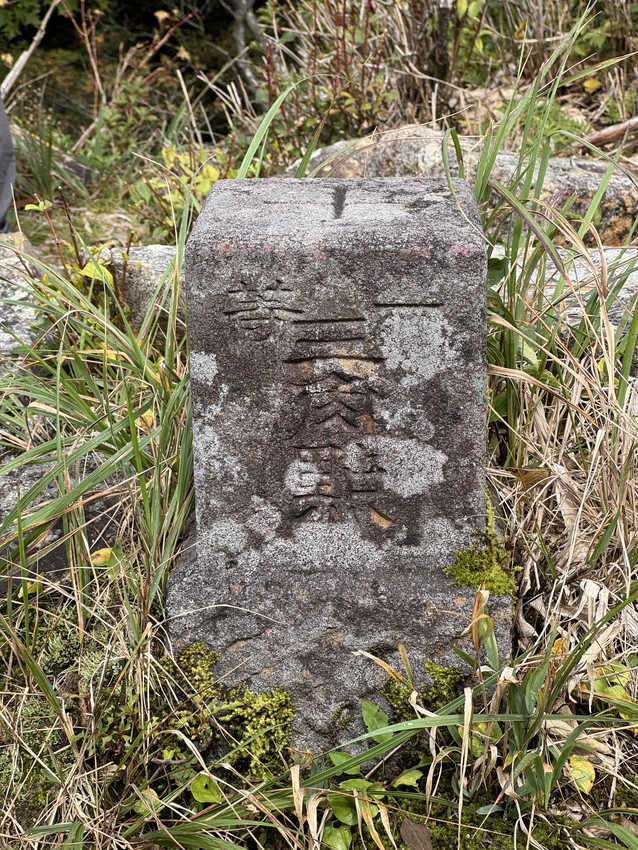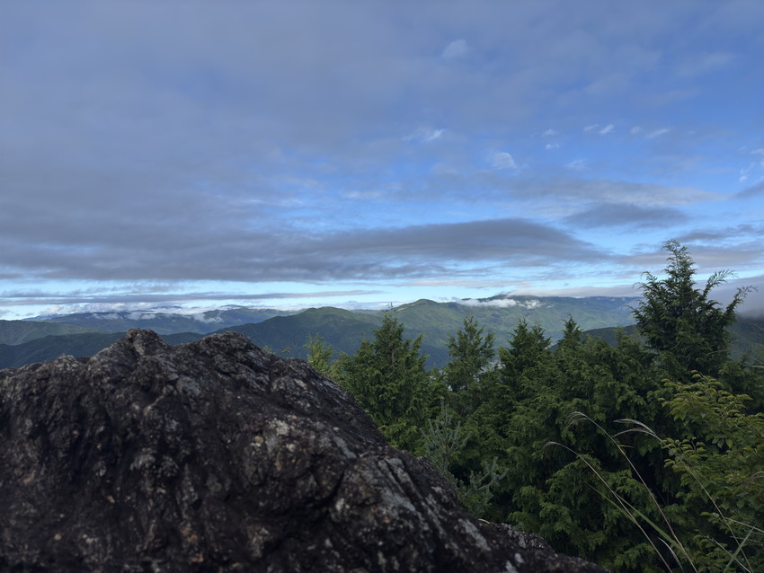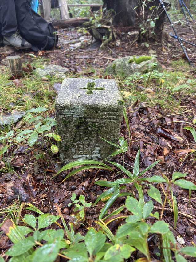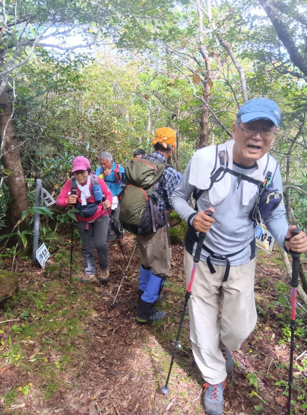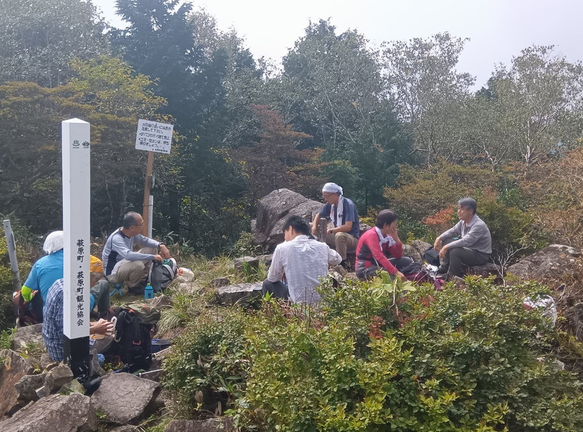 ・登山口で眼下に萩原の街、雲の下には南飛騨の山並を展望後、濡れ落葉に注意しながら急坂を登りきると鷹巣岩に至り小休止。鷹巣観音が祀られており信仰の山であることが分かる。自然林が広がるようになり尾根道の森林浴を楽しむ。1341mの三角点があるブナ林の憩いの広場で大休止。その後、灌木と笹薮をかき分けながら進むが次第に気温と湿度が高まり汗が噴き出してきた。高圧線鉄塔を潜り抜けて次の鉄塔下で休憩。そこには鉄塔管理用と思われる作業小屋があるが中へは入れない。頂上はすぐ先だった。大きな三角点は1等で意外。その後ろに祠があって背後の大岩が最高点。よじ登って岩の上に立つが眼前に聳えるはずの御嶽山は雲の中であった。