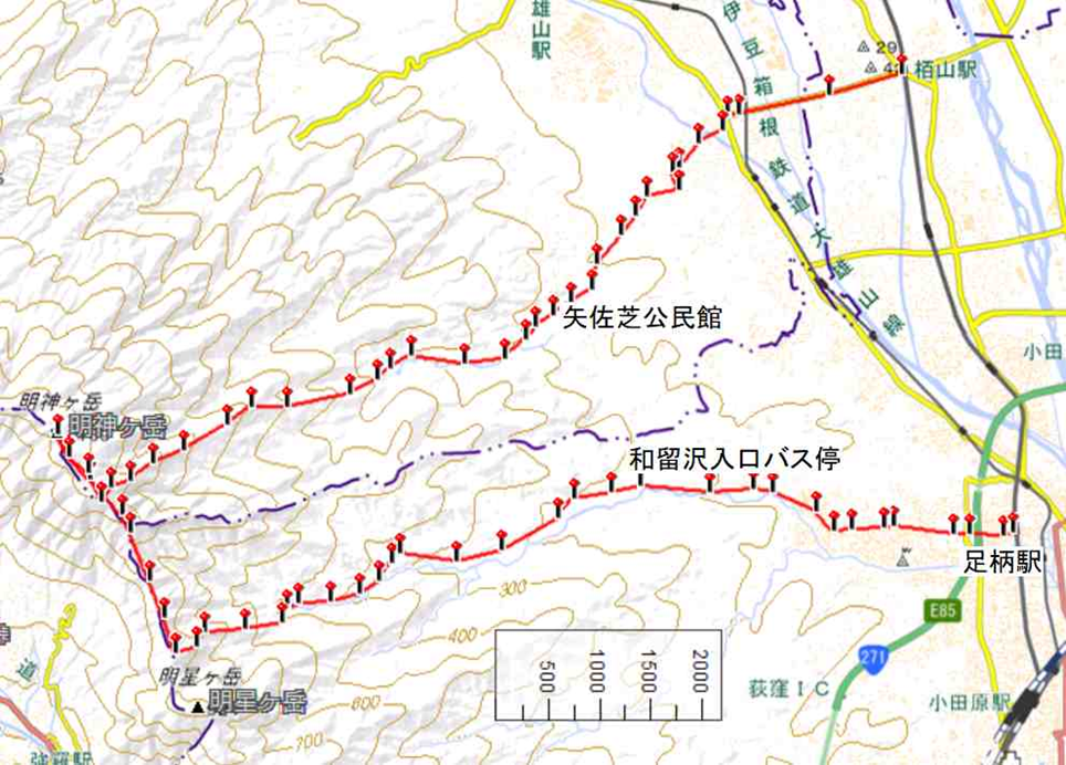 | 632栢山駅→ 819二宮金次郎腰掛け石→ 836登山口→ 1107明神ヶ岳1134→ 1224奥和留沢見晴らしコース分岐 →1337登山口 →1420和留沢入口バス停 |