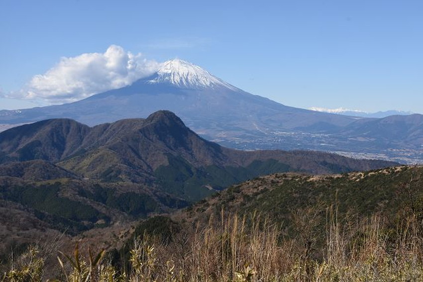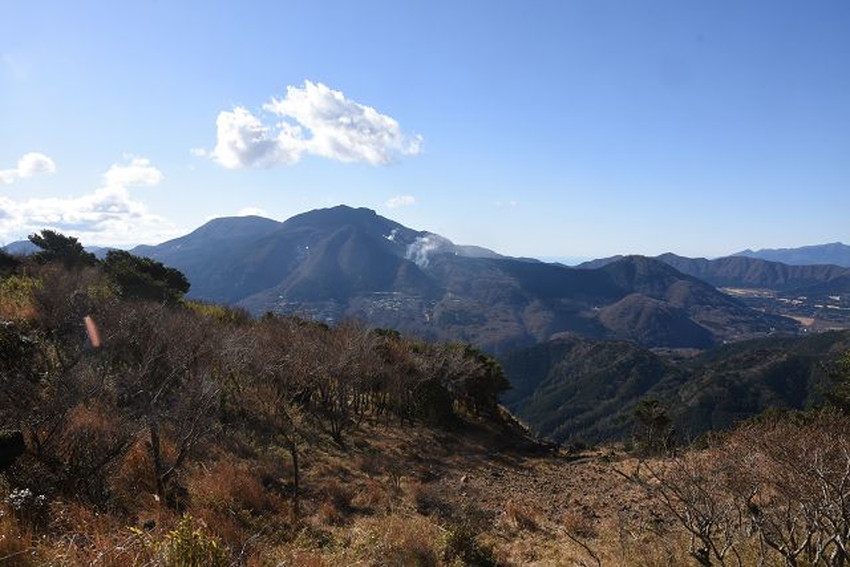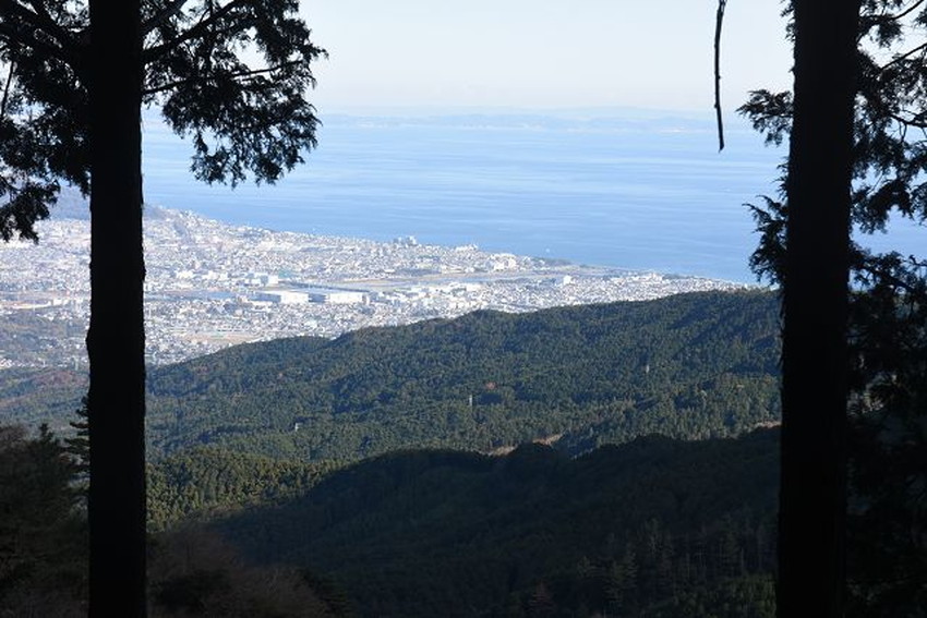 - 登山口からかなりの間人工林が続いたが、途中から自然林となり、木々の間から丹沢の山々や湘南海岸などが見えてきた。