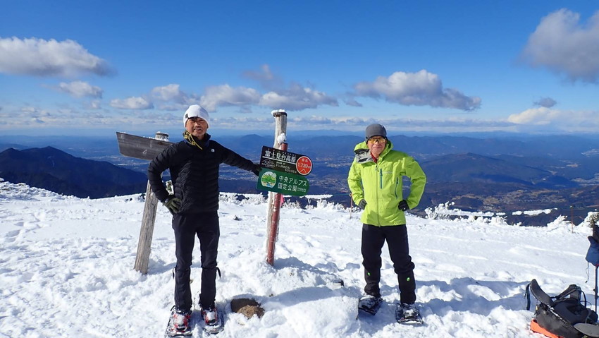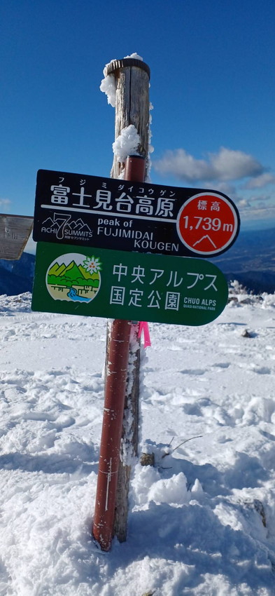 ・初めてのスノーシューそして冬靴を履き、富士見台に登りました。夏なら余裕も持てたと思いますが、予想どおり悪戦苦闘斜面も穏やかで、山頂の景観「御岳、中央及び南アルプス」は最高のロケーションでしたが、歩行に気がいってしまい、残念!ただ、雪山歩行練習の成果はマックス十分でした。(SEIJI)