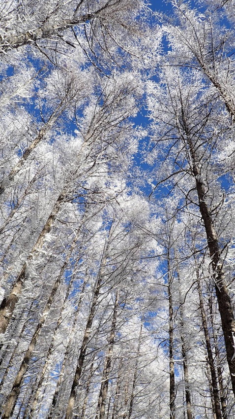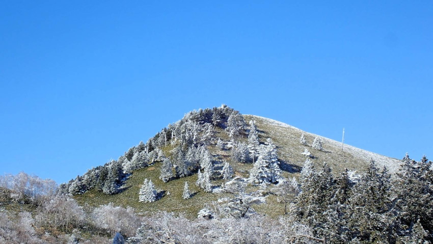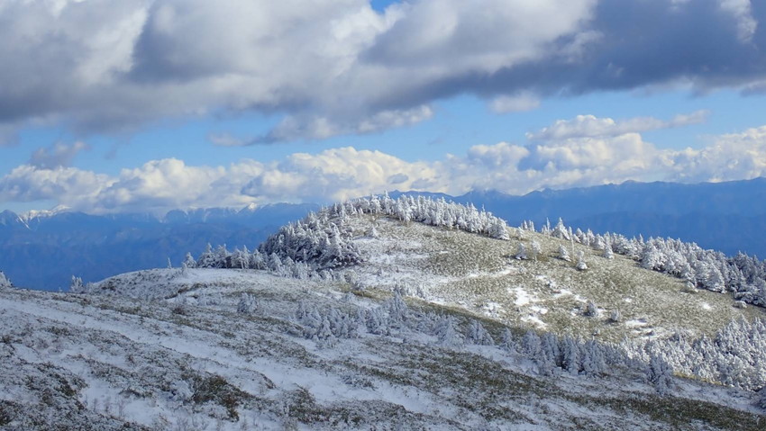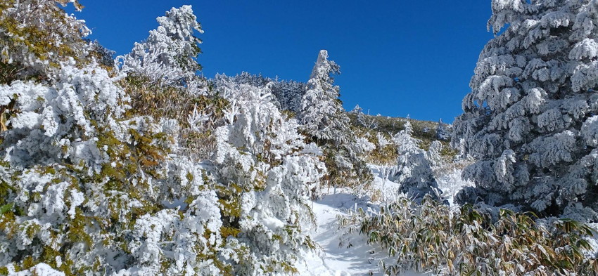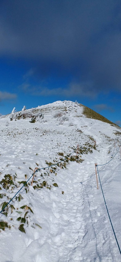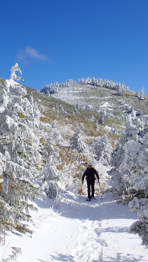 ・笹山にもみの木が樹つ富士見台は雪が降ると特別な景観になります、樹氷となって白く凍るもみの木他、一面に生える笹の葉の緑「白とグリーンの世界」はとてもメルヘンチックな景観です。往復の行程が11㎞あるので充分にスノーハイクも楽しむことが出来る山です。今回は降りたてのフカフカの雪を楽しんで歩くことが出来ました。(吉D)