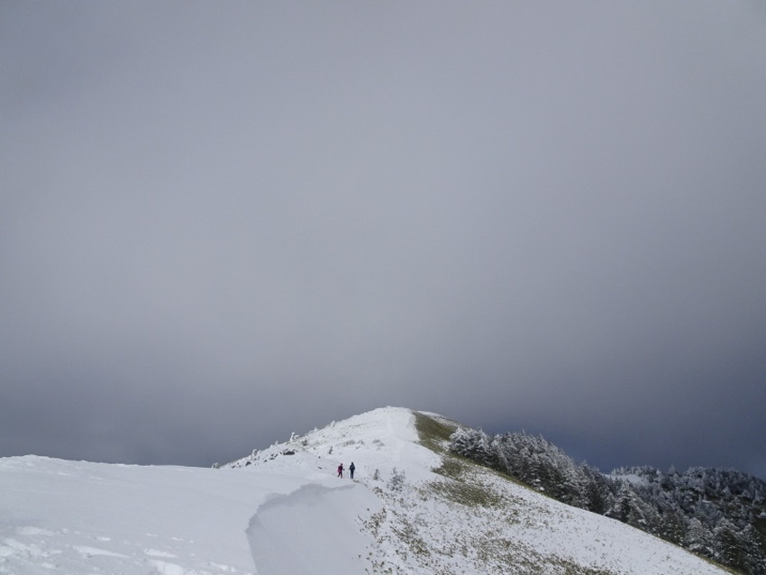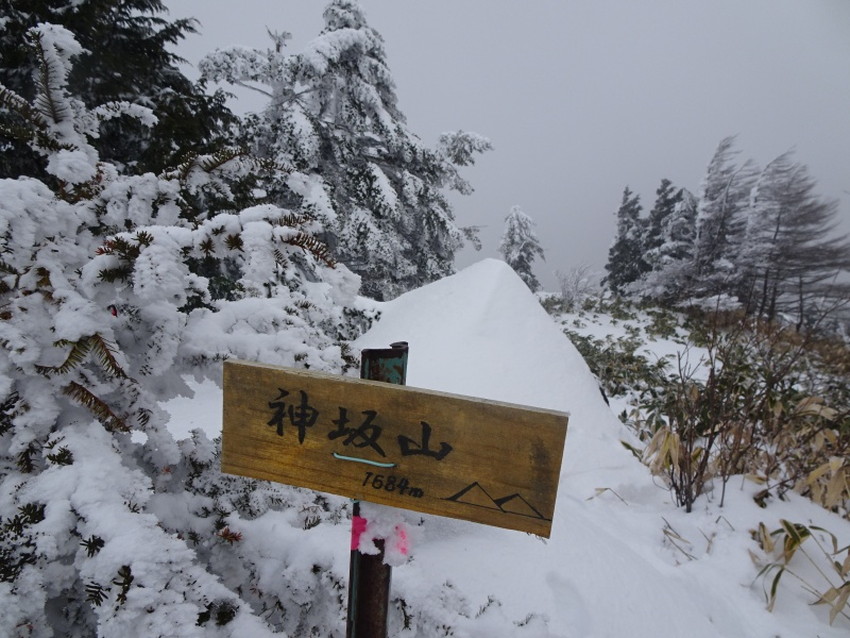 - ここから「神坂山」への分岐を見るとスノーシューのトレースが有りそのままツボ足で辿ると少し埋まるがなんとか進めそうなので急な道を進む最後の方は笹原を膝下まで埋まりながらなんとか尾根道へ出たここから「神坂山」の山頂に向かおうとしたが膝上まで沈みそうなので急遽スノーシューを装着しトレースがほぼ無い山頂までの膝下まで埋まりながら山頂に辿り着いた。