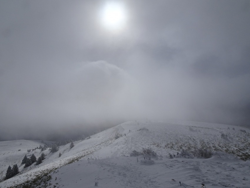 - 神坂山からの下山は自分が造ったトレースを利用し尾根分岐へそれから薄いトレースを利用して「富士見台高原」へ向かう視界不良と雪に埋まりながら結局2時間程かかってやっと富士見台高原山頂へ、景色も見れないし風があって寒いのでそそくさと下山へ、下山しだしたら何故か?晴れだし360度の展望が見れるようになり綺麗な南アルプスも見れた、名残り惜しいが「萬岳荘」でスノーシューを外し昼食をとり、下山は中華チェーンスパを装着して下山へ。